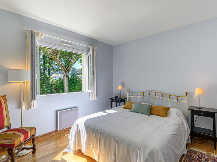 "Kerdréan", 4-Zimmer-Haus 150 m2. Komfortabel eingerichtet: Wohn-/Esszimmer 40 m2 mit offenem Kamin und TV (Flachbildschirm). Ausgang zur Terrasse. 1 Zimmer mit 1 franz. Bett (1 x 140 cm, Länge 190 cm), Dusche. Küche (Backofen, Geschirrspüler, 4 Flammen, Toaster, Wasserkocher, Mikrowelle, elektrische Kaffeemaschine). Sep. WC. E-Heizung. Obergeschoss: 1 Zimmer mit 1 Bett (90 cm, Länge 190 cm), 1 franz. Bett (1 x 140 cm, Länge 190 cm). 1 Zimmer mit 2 Betten (90 cm, Länge 190 cm). Galerie mit 1 Bett (90 cm, Länge 190 cm). Bad, sep. WC. Terrasse 40 m2, Südlage. Terrassenmöbel, Gartengrill, Liegestühle (2). Zur Verfügung: Waschmaschine, Bügeleisen, Haartrockner. Internet (WLAN, extra). Bitte beachten: Rauchmelder. Inserat einer Privatperson nach Artikel 155, IV, CGI.